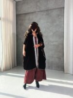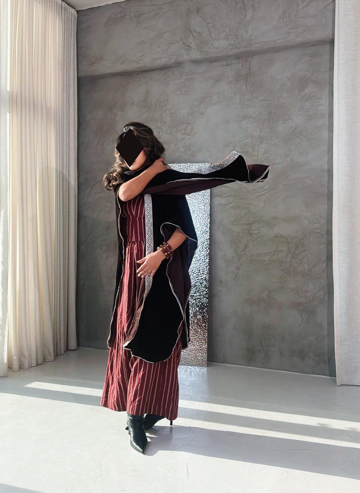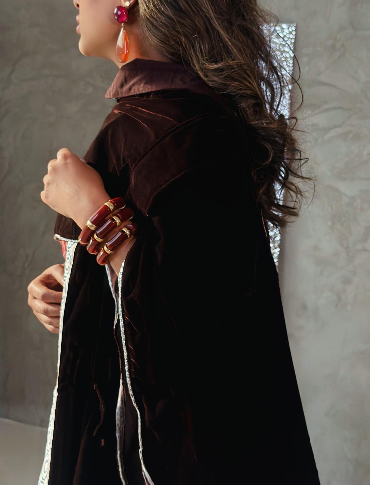 - - burgundy velvet shawl with two cargo pockets & hoodie